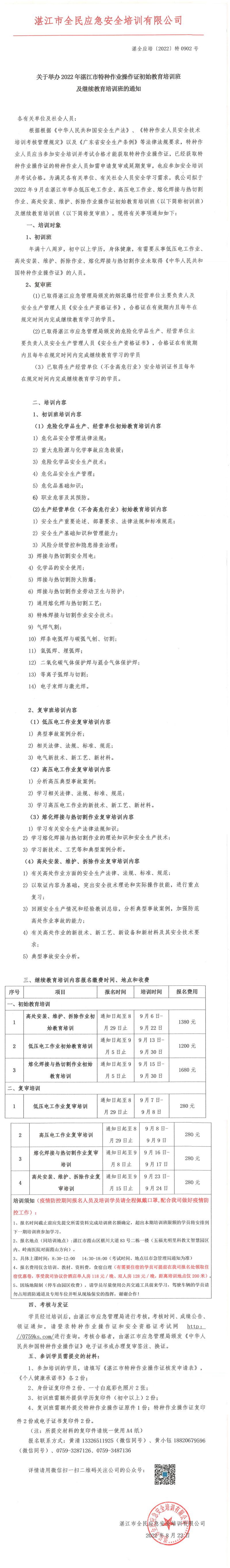 2022年9月低压电工、高压电工、熔化焊接与热切割作业、高处作业初始教育培训班及继续教育培训班的通知