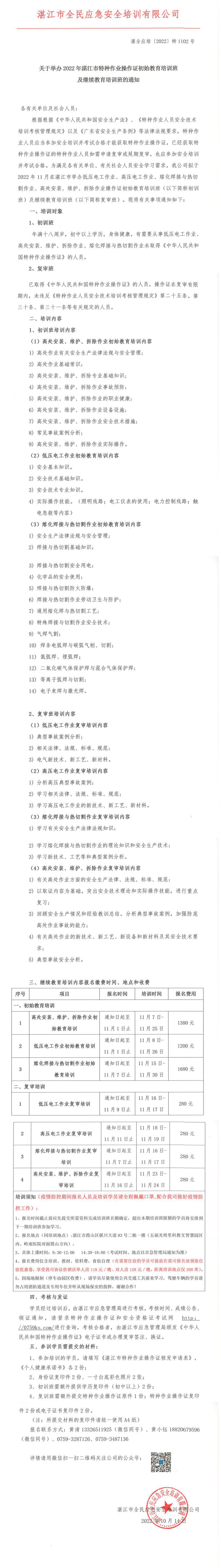 2022年11月低压电工、高压电工、熔化焊接与热切割作业、高处作业初始教育培训班及继续教育培训班的通知