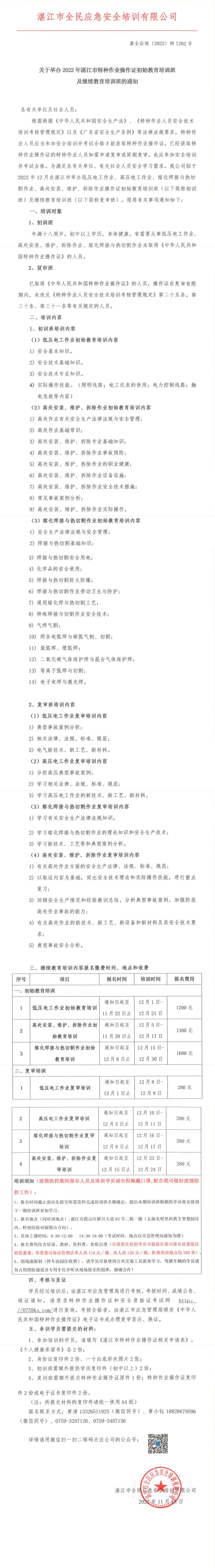 2022年12月低压电工、高压电工、熔化焊接与热切割作业、高处作业初始教育培训班及继续教育培训班的通知