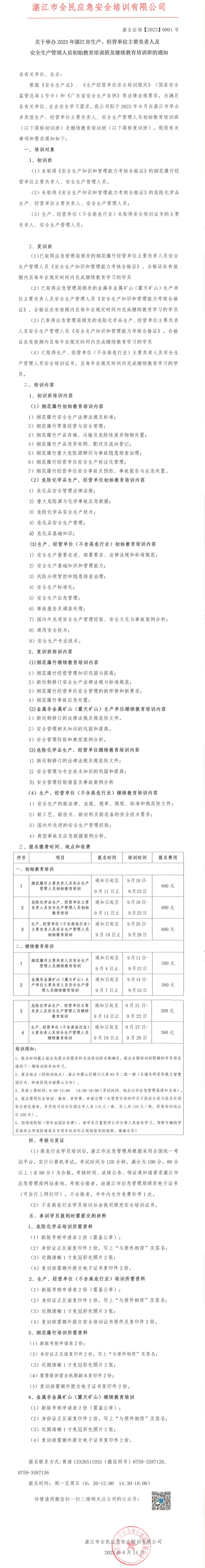 2023年9月湛江市生产、经营单位主要负责人及安全生产管理人员初始教育培训班及继续教育培训班的通知