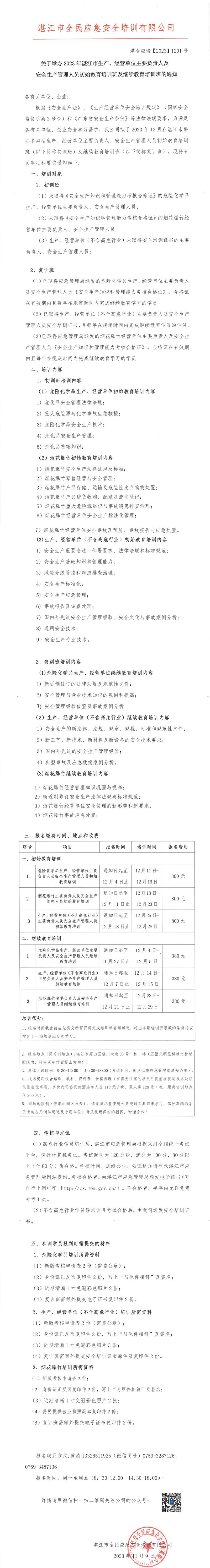 2023年12月湛江市生产、经营单位主要负责人及安全生产管理人员初始教育培训班及继续教育培训班的通知