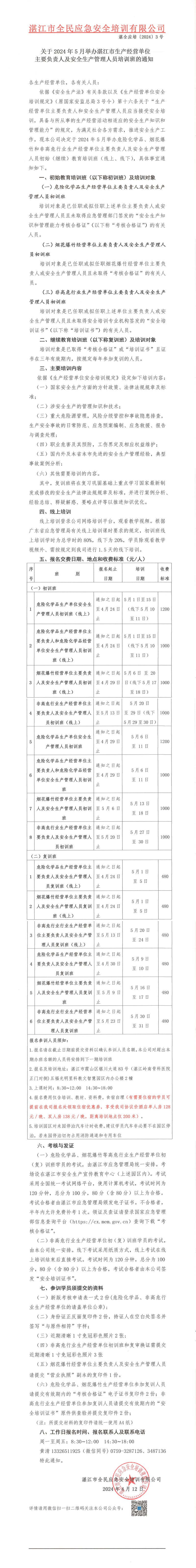 2024年5月湛江市生产经营单位主要负责人及安全生产管理人员初始教育培训班及继续教育培训班的通知