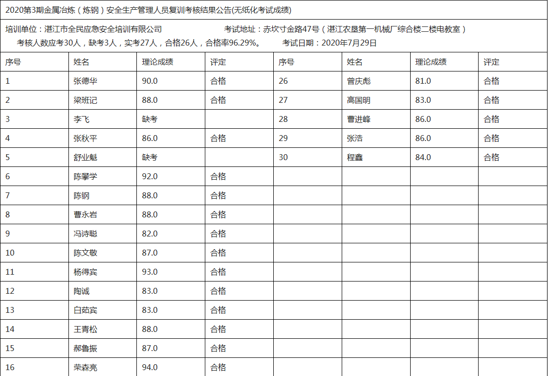 2020第3期金属冶炼(炼钢)安全生产管理人员复训考核结果公告(无纸化考试成绩)