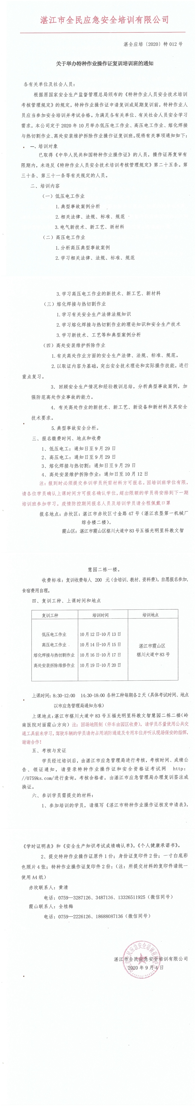2020年10月12日-10月20日低压电工、高压电工、熔化焊接与热切割和高处安装维护拆除复训班