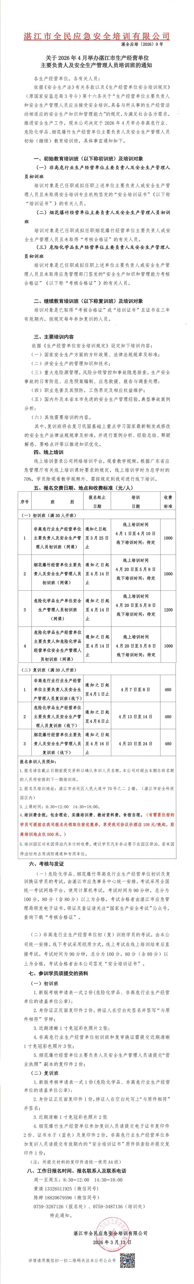 2026年4月湛江市生产经营单位主要负责人及安全生产管理人员培训班的通知