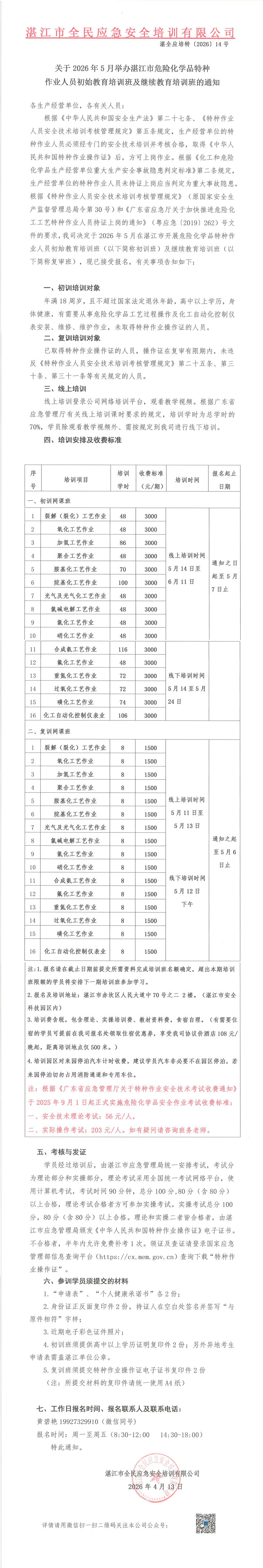 关于举办2026年5月份湛江市危险化学品特种作业初训培训班的通知
