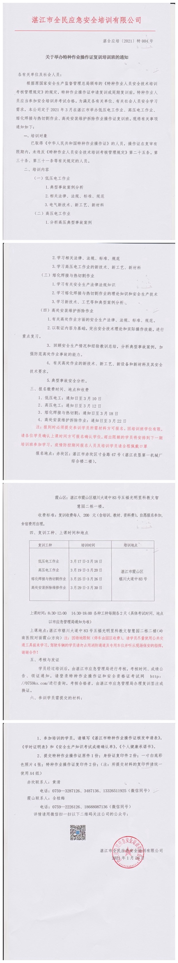 2021年3月17-3月30日低压电工、高压电工、熔化焊接与热切割、高处安装维护拆除作业操作证复训培训班通知