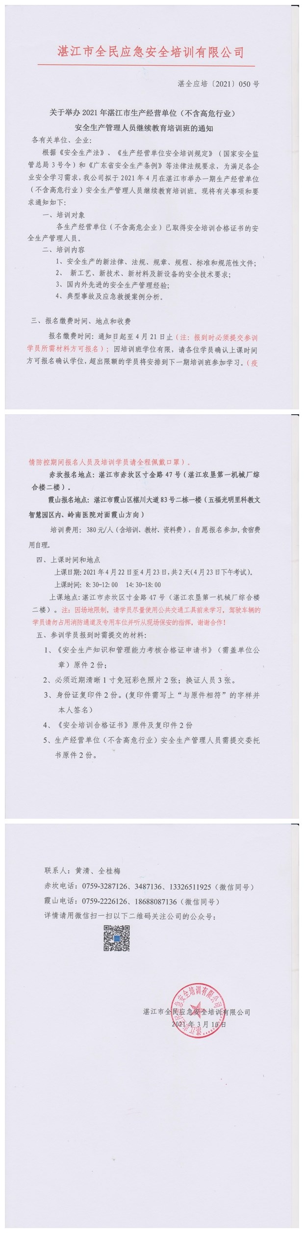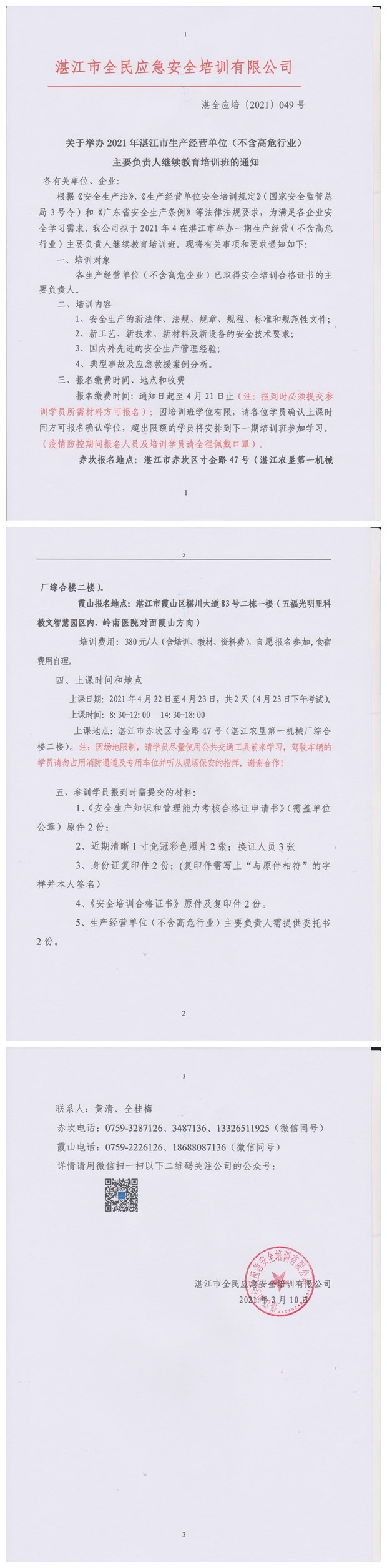 2021年4月22日-4月23日生产经营单位(不含高危行业)主要负责人及安全管理人员继续教育培训班通知