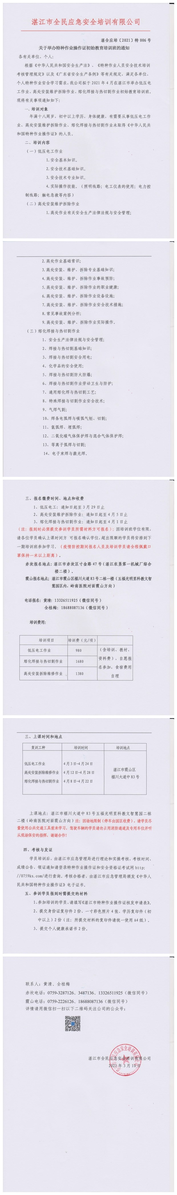 2021年4月3日-4月28日低压电工、高处作业、熔化焊接与热切割初始教育培训班通知