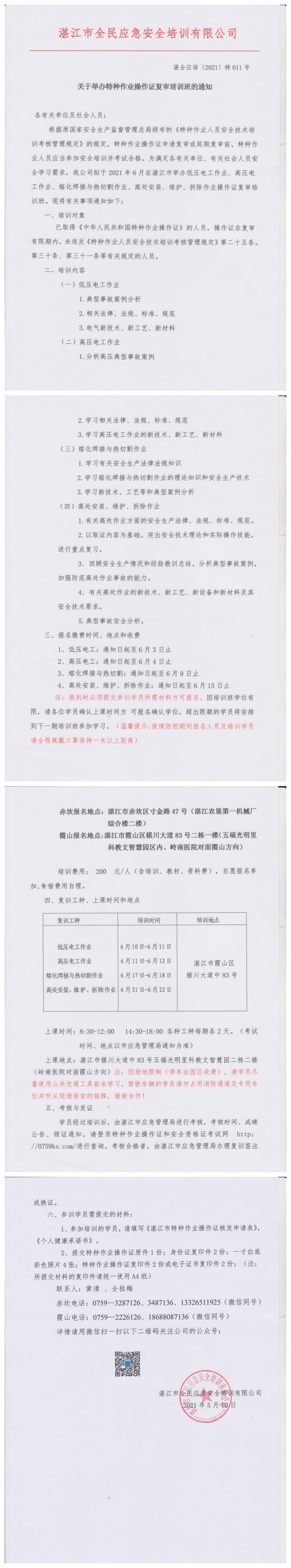2021年6月10日-6月22日低压电工、高压电工、熔化焊接与热切割作业、高处作业复审培训班通知