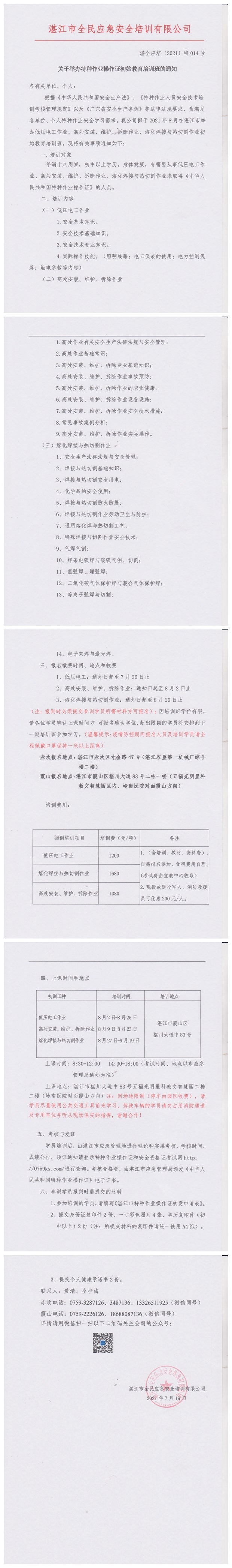 2021年8月2日-9月19日低压电工、高处作业、熔化焊接与热切割初始教育培训班通知