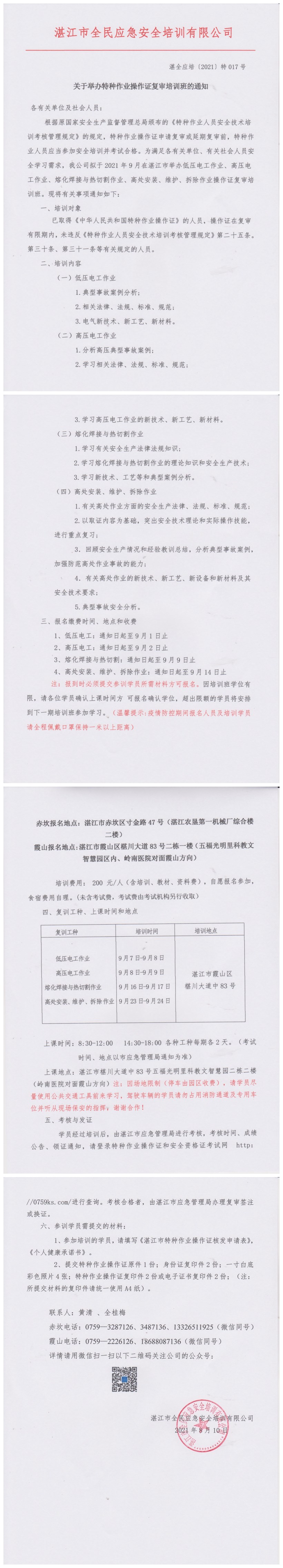 2021年9月7日-9月24日低压电工、高压电工、熔化焊接与热切割作业、高处作业复审培训班通知