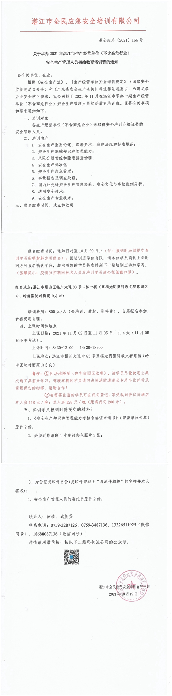 2021年11月2日-11月5日生产经营单位(不含高危行业)主要负责人及安全管理人员初始教育培训班通知