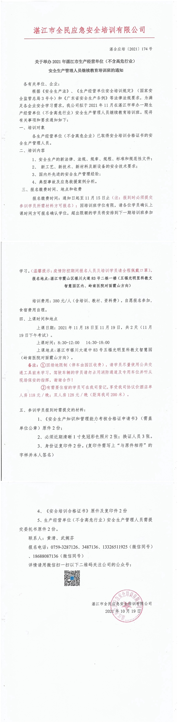 2021年11月18日-11月19日生产经营单位(不含高危行业)主要负责人及安全管理人员继续教育培训班通知