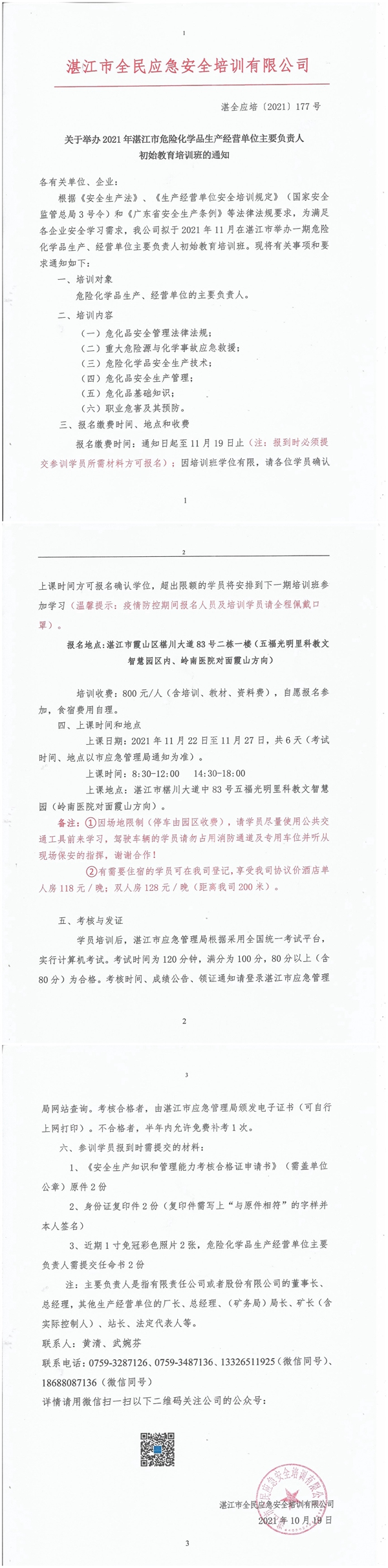 2021年11月22日-11月27日危险化学品生产、经营单位主要负责人及安全管理人员初始教育培训班通知