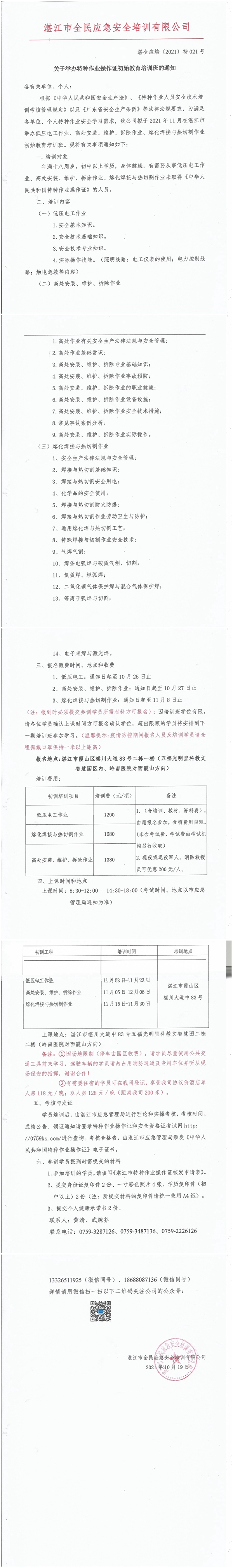 2021年11月3日-11月30日低压电工、高处作业、熔化焊接与热切割初始教育培训班通知