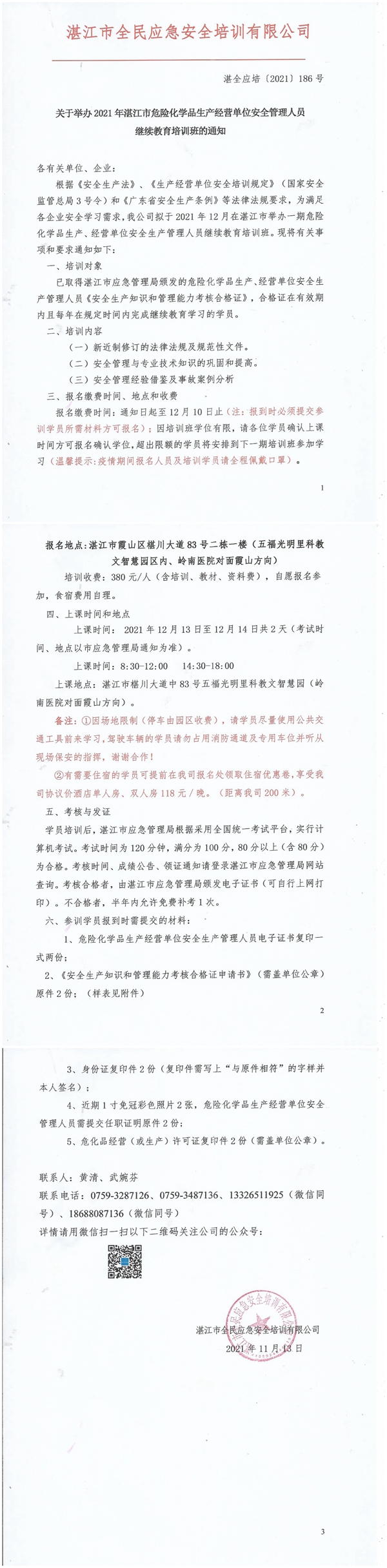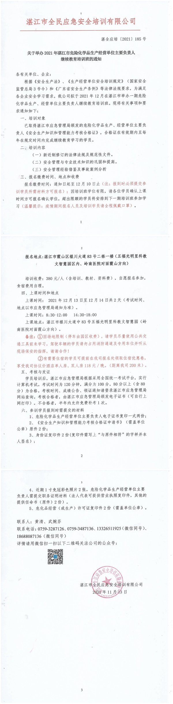 2021年12月13日-12月14日危险化学品生产、经营单位主要负责人及安全管理员继续教育培训班通知