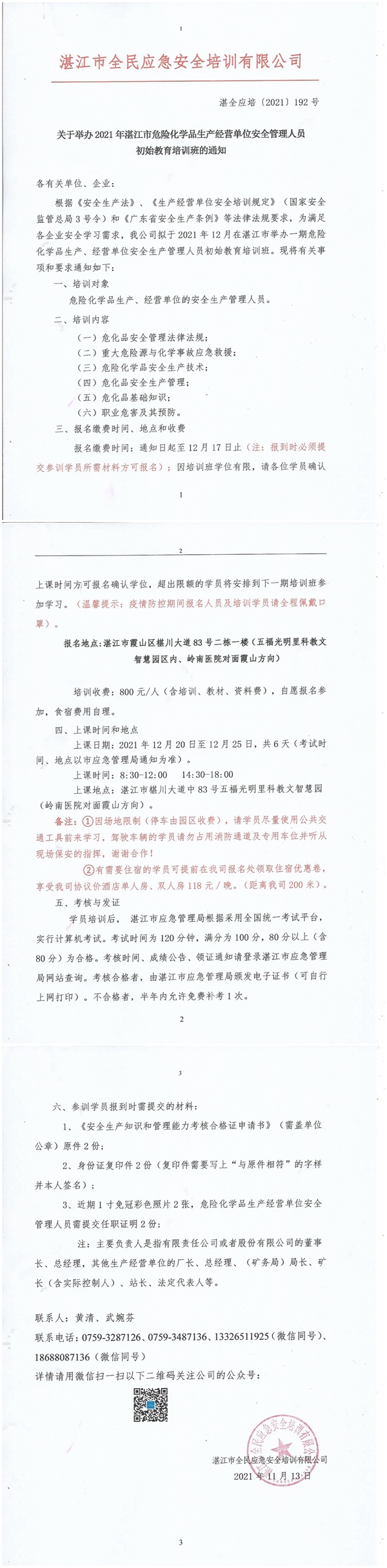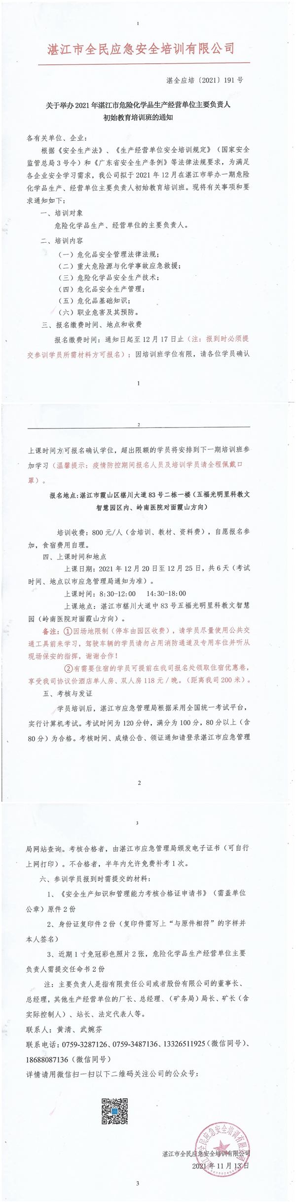 2021年12月20日-12月25日危险化学品生产、经营单位主要负责人及安全管理人员初始教育培训班通知