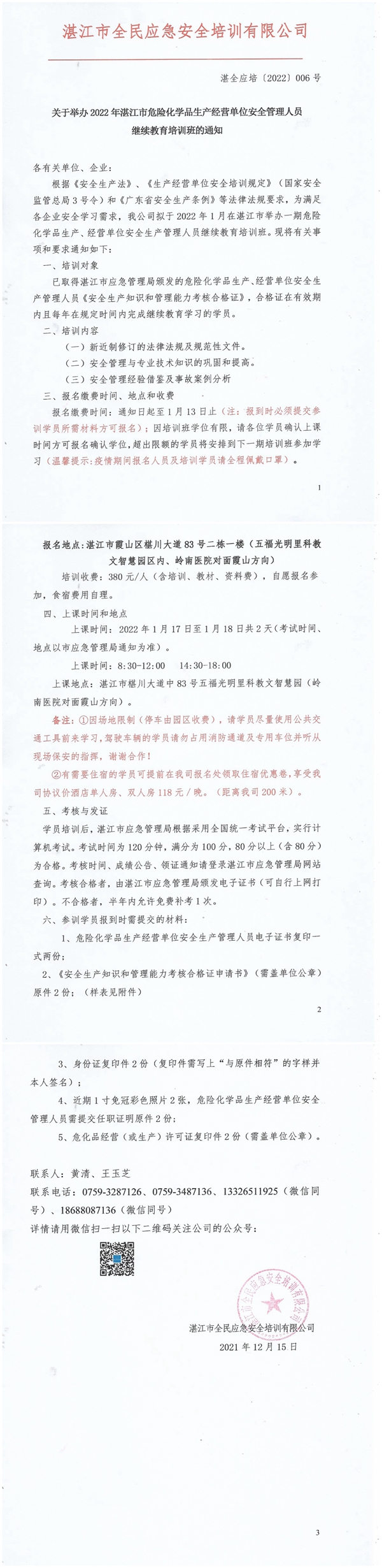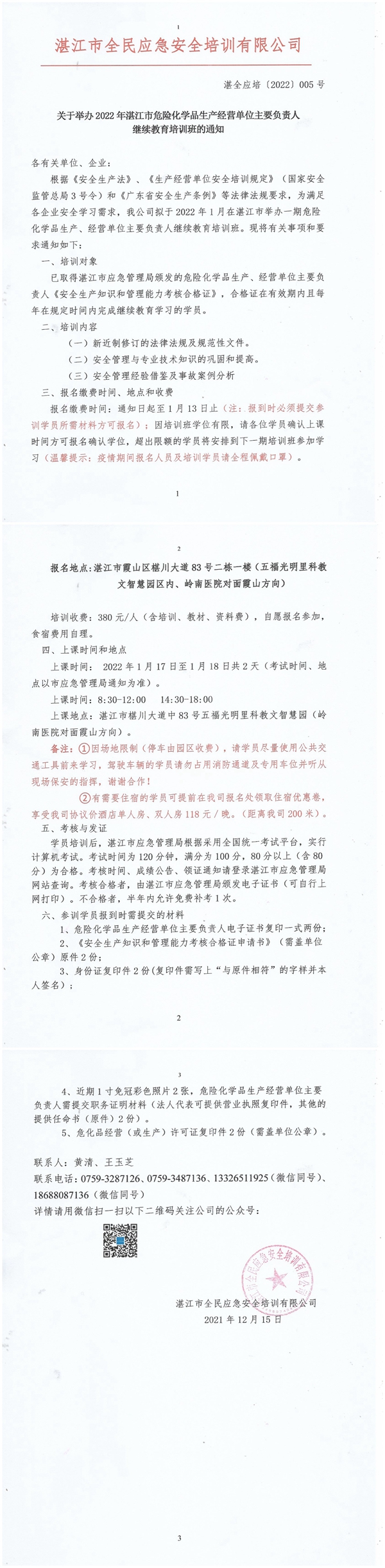 2022年1月17日-1月18日危险化学品生产经营单位主要负责人及安全管理人员继续教育培训班通知