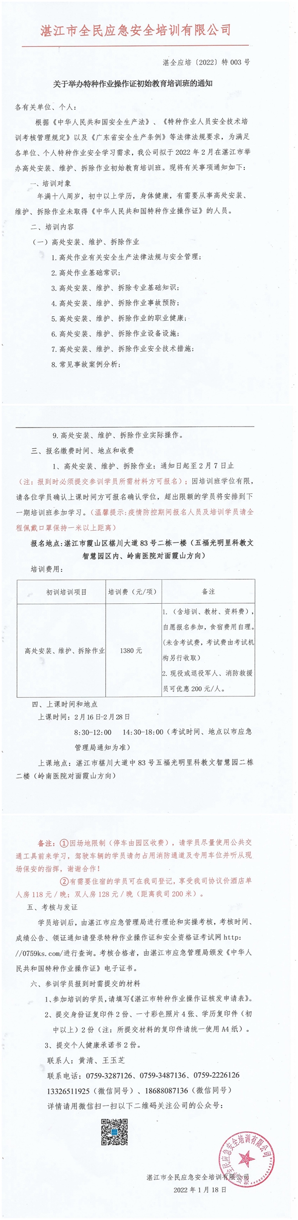 2022年2月16日-2月28日高处作业初始教育培训班通知