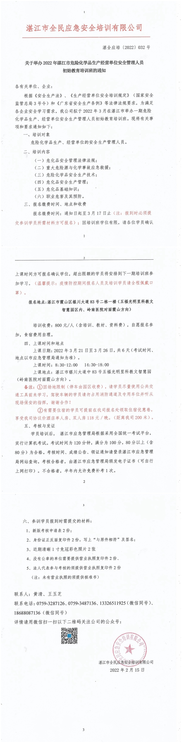 2022年3月21日-3月26日危险化学品生产、经营单位主要负责人及安全管理人员初始教育培训班通知